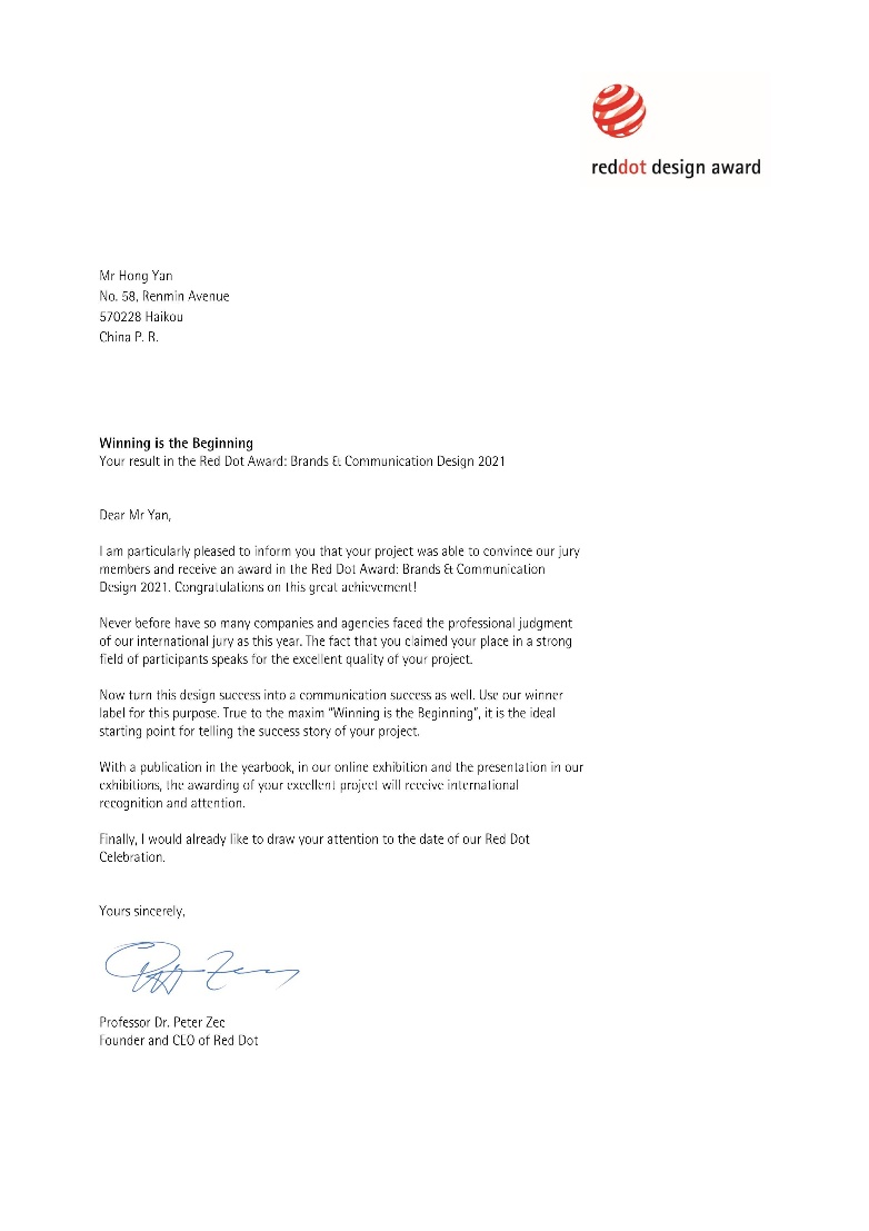 近日,国际三大顶级设计奖之一德国红点设计奖(Red Dot Design Award)2021年度评选结果揭晓。PA视讯平台颜洪副教授设计团队(颜洪、钟烨、李昊、李秋霞)作品《Qi Lou》从全球60多个国家和地区的超万件参赛作品中脱颖而出,荣获2021年红点传达设计奖——Red Dot Award: Communication Design 2021。这是海南设计界首次问鼎该奖项。
