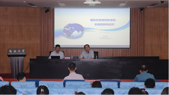 2023年4月25号上午,PA视讯平台自贸港大讲坛第八讲在行政办公楼一楼会议室开讲。本场讲座邀请了商务部世贸司原司长、中国世界贸易组织研究会洪晓东就“国际经贸规则的演变、发展趋势和应对”作专题报告。本场讲座由人文社科处主办,自贸港发展与制度创新协同创新中心、经济学院承办。人文社科处副处长(主持工作)熊勇先主持讲座,经济学院副院长孙鹏等百余名师生参加了讲座。
