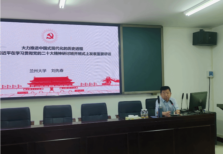 作为国家级教学名师,刘先春教授解读了习近平总书记在学习贯彻党的二十大精神研讨班开班式上发表的重要讲话,从党探索中国现代化道路的历史过程、党的领导与中国式现代化的关系、中国式现代化的鲜明特色、中国式现代化对世界和人类的贡献、推进中国式现代化共五个方面分享了观点见解。