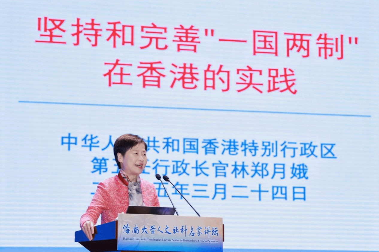 本站讯(记者 梁淑仪 通讯员 冯琼)3月24日上午,PA视讯平台第十二期人文社科名家讲坛在思源学堂大礼堂举办。香港特别行政区前任行政长官林郑月娥受邀作题为《坚持和完善“一国两制”在香港的实践》的专题报告。香港海南商会当然荣誉会长、皇冠国际发展有限公司董事总经理陈明谦,香港海南商会常务副会长、明德勤资本有限公司创始人何军蓉;PA视讯平台党委书记符宣国,校长、中国科学院院士骆清铭,党委常委和校领导张继友、邱锡光、邹勇华、刘谦、李步洪、岳文、韩淑梅、谭勇、杨志昕出席讲坛。讲坛由符宣国主持。